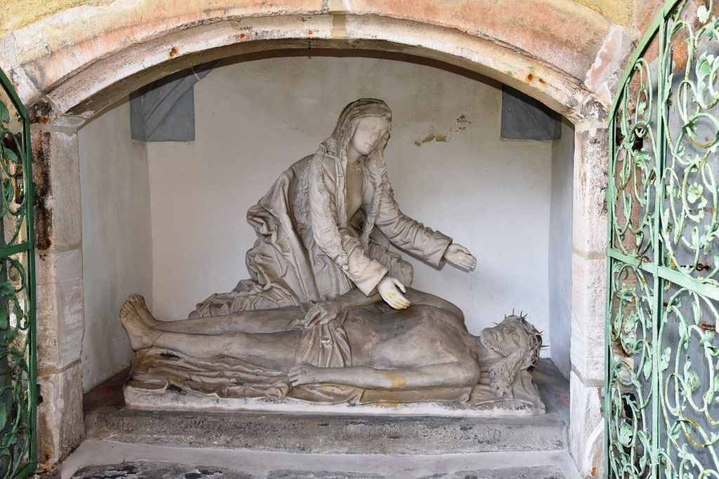 Nun hat die Mutter ihren Sohn wieder. In ihrem mütterlichen Mantel findet der tote Herr erste Geborgenheit. Jesus hat ausgelitten. Seine durchbohrten Hände und Füße und das geöffnete Herz blutet nicht mehr. Aber das Herz der Mutter blutet aufs Neue und ihr Herz muss sich ausweinen in dieser Bitternis. Bitterer noch durchbohrt ihre Seele die Trauer über die Furchtbarkeit der Sünde, die solch grausamen Sold fordert. Dieser Trauer aber hat der Herr verheißen: „Selig die Trauernden, denn sie werden getröstet werden“.