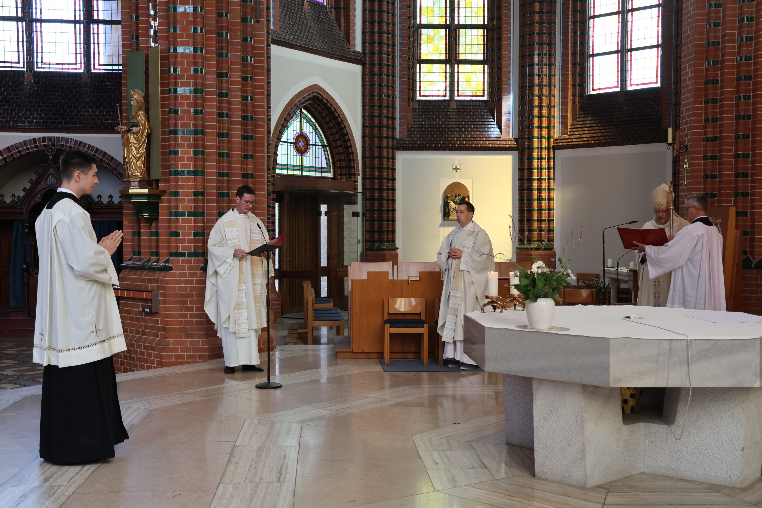 Am gestrigen Donnerstag, den 7. August 2025 hat Bischof Wolfgang Ipolt im Rahmen der Mitarbeitermesse des Bischöflichen Ordinariats Herrn Maximilian Mattner die Admissio erteilt. Nachdem Herr Mattner den theoretischen Teil seiner Ausbildung im Priesterseminar in Münster erfolgreich abgeschlossen hat, ist er durch die Admissio zugelassen zur weiteren Vorbereitung auf die Diakonenweihe und Priesterweihe. Nach der Vorstellung des Kandidaten durch den Ausbildungsleiter für die Priesterkandidaten des Bistums, Generalvikar Markus Kurzweil, erteilte Bischof Ipolt Herrn Mattner die Admissio. Damit kann er nun sein pastorales Praktikum beginnen, welches er in der Pfarrei Wittichenau ableisten wird. Nach einem Jahr steht dann in der Regel die Diakonenweihe als nächster Schritt auf dem Weg zu Priesterweihe an.