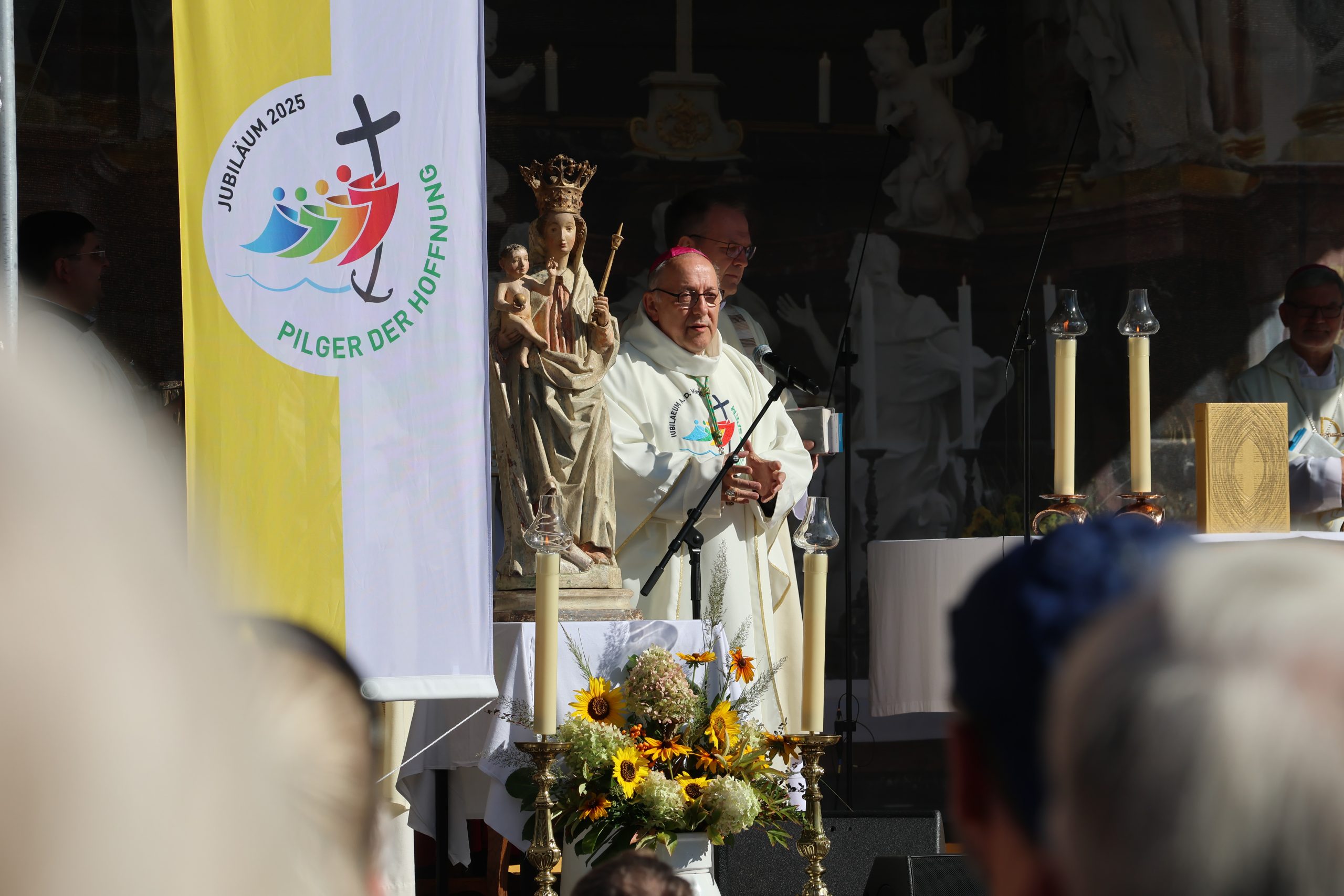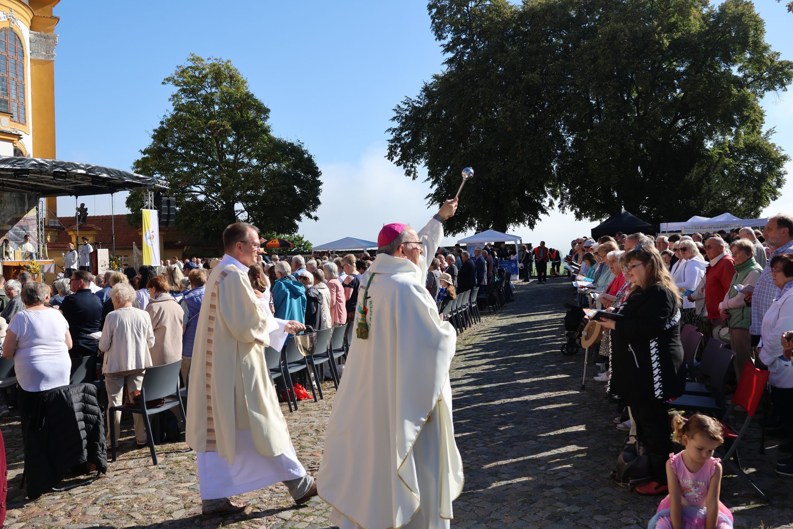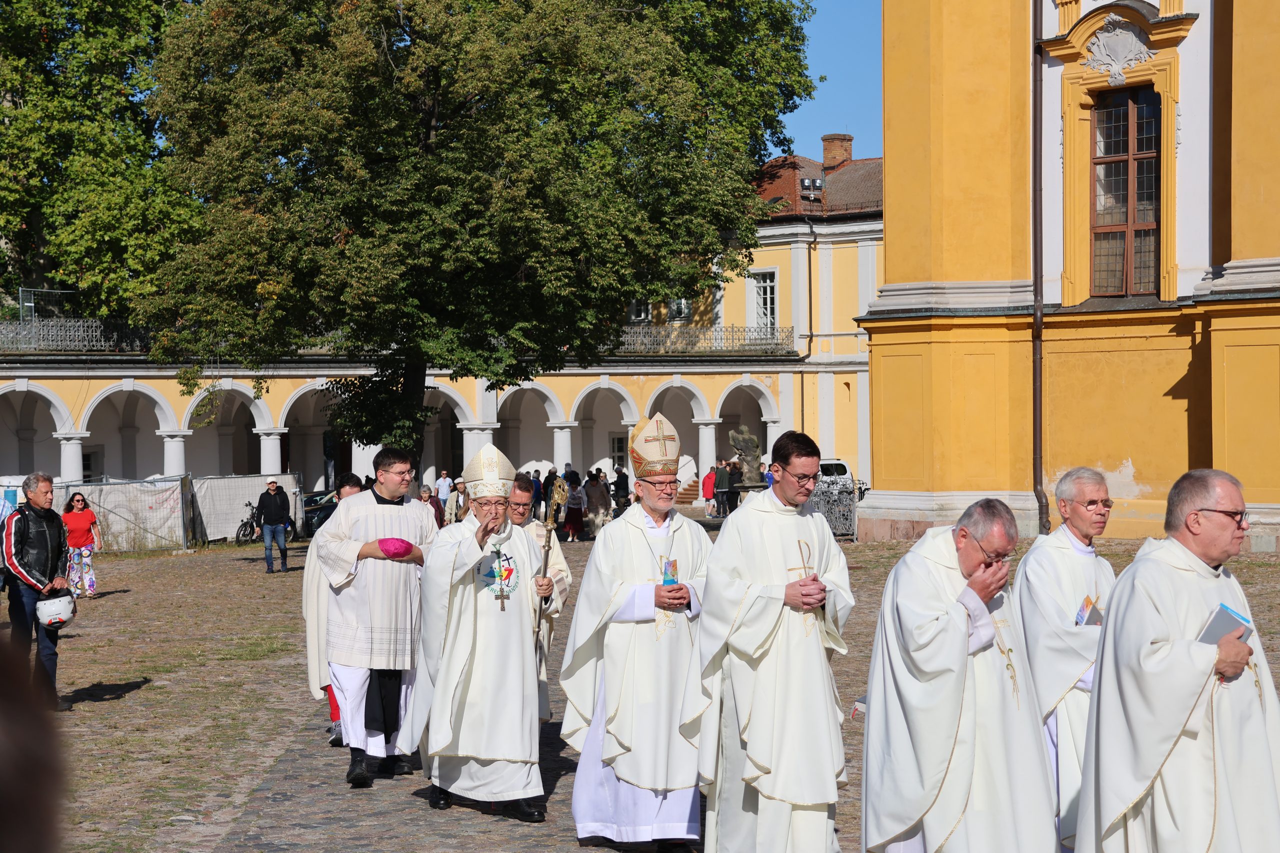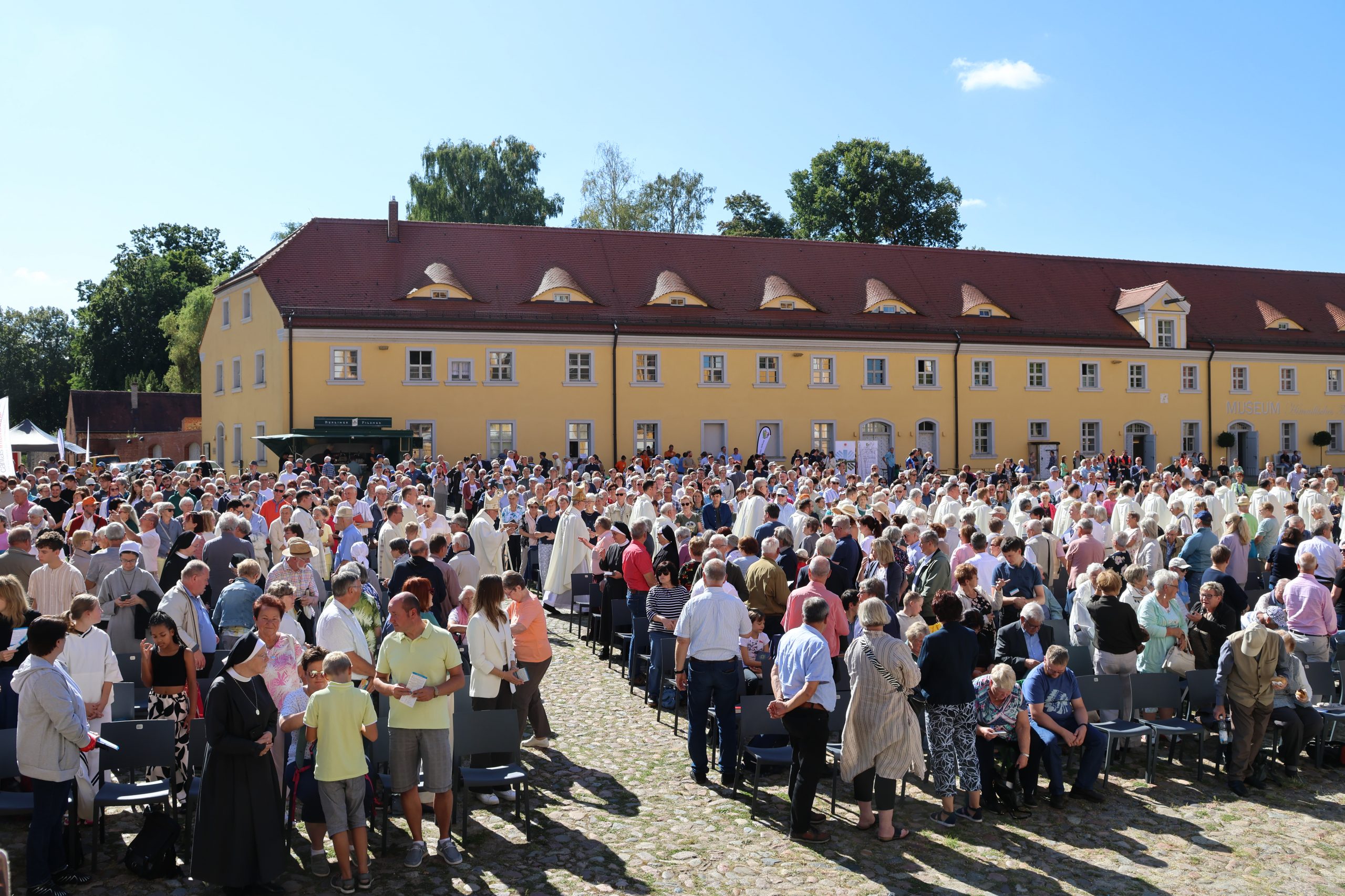 Am gestrigen Sonntag, dem 7. September 2025, fand auf dem Stiftsplatz in Neuzelle die Bistumswallfahrt des Bistum Görlitz statt. Der Einladung von Bischof Wolfgang Ipolt folgten über 1000 Gläubige. Belohnt wurden sie mit bestem Wetter und einem vielfältigen Programmangebot unter dem Motto „Pilger der Hoffnung werden“, dem Jahresthema des Bistums, das sich an das Motto des Heiligen Jahres 2025 „Pilger der Hoffnung“ anlehnt. Als Ehrengast nahm Bischof Clemens Pickel aus dem Bistum St. Clemens in Saratow in Russland an der Wallfahrt teil. Er konzelebrierte im Wallfahrtshochamt und hielt die Predigt in der Abschlussandacht der Wallfahrt in der Stiftskirche.