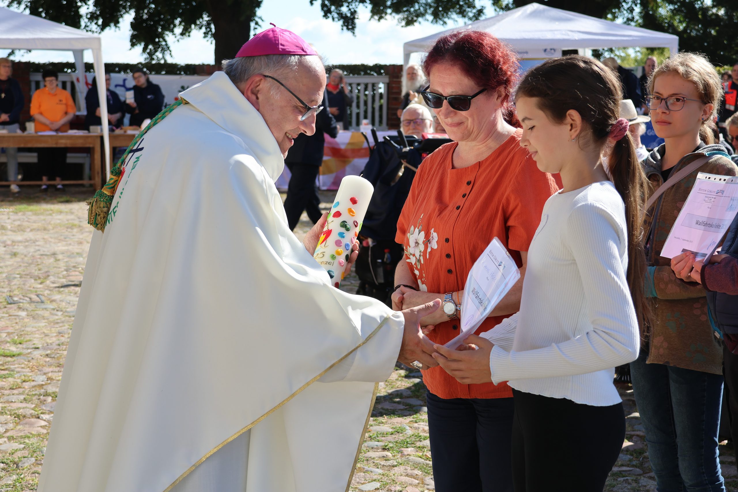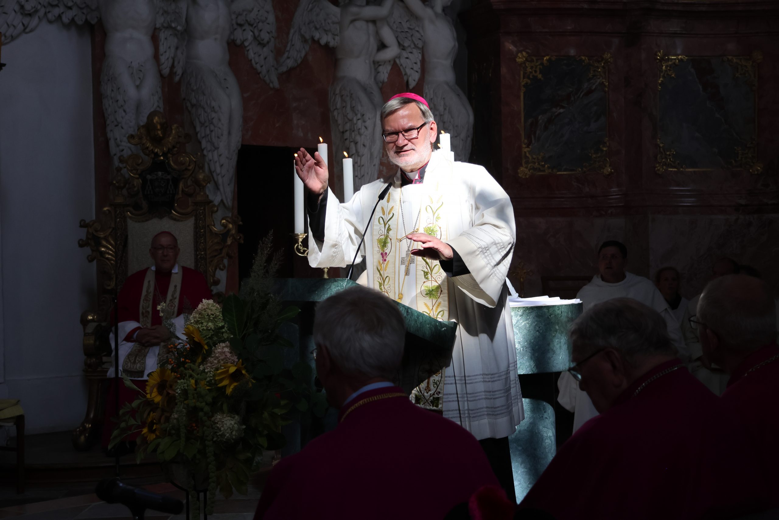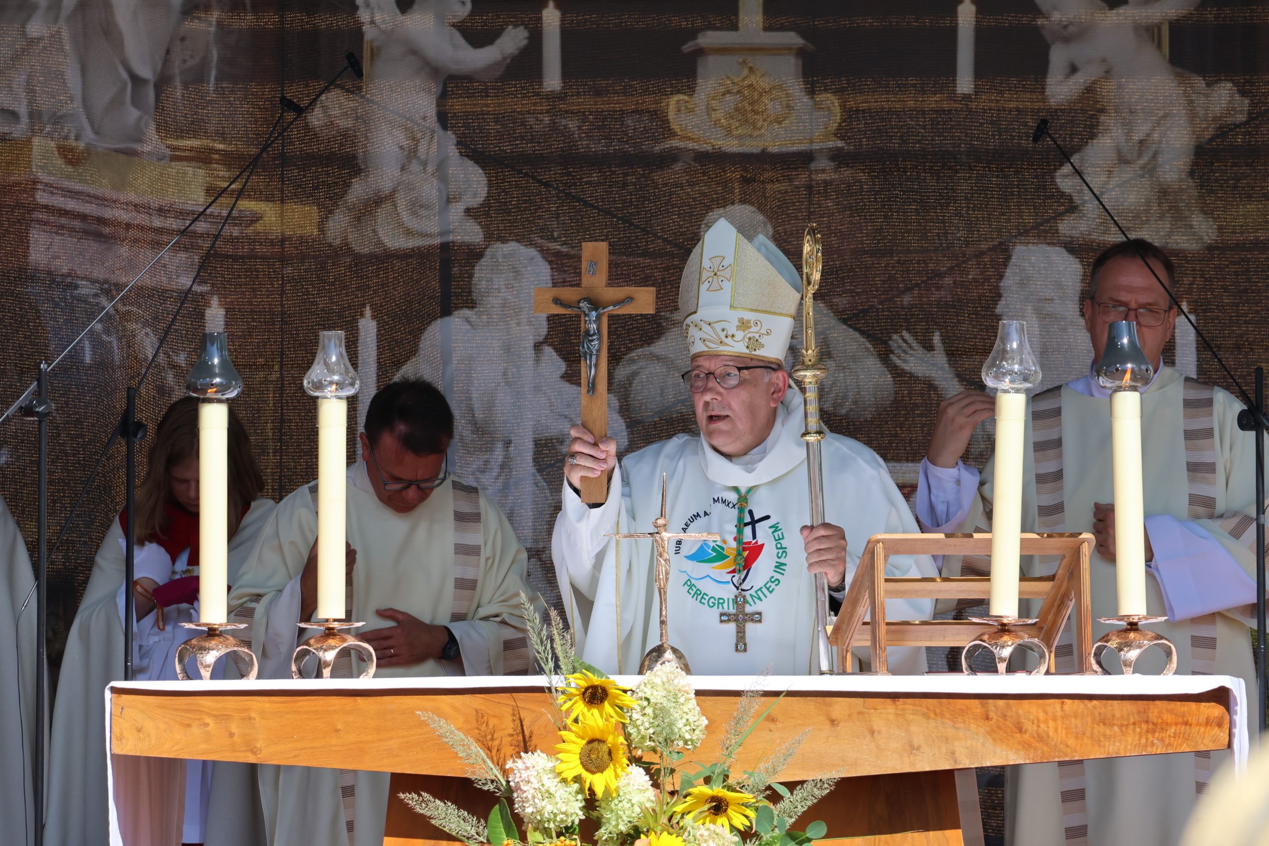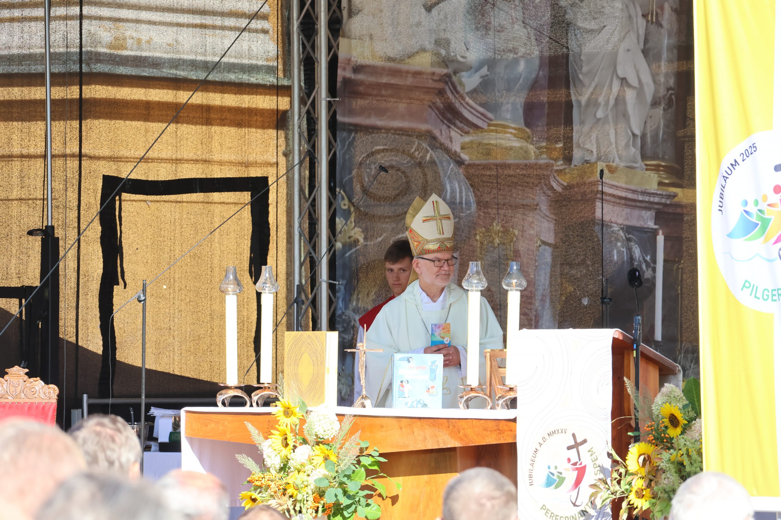 Am gestrigen Sonntag, dem 7. September 2025, fand auf dem Stiftsplatz in Neuzelle die Bistumswallfahrt des Bistum Görlitz statt. Der Einladung von Bischof Wolfgang Ipolt folgten über 1000 Gläubige. Belohnt wurden sie mit bestem Wetter und einem vielfältigen Programmangebot unter dem Motto „Pilger der Hoffnung werden“, dem Jahresthema des Bistums, das sich an das Motto des Heiligen Jahres 2025 „Pilger der Hoffnung“ anlehnt. Als Ehrengast nahm Bischof Clemens Pickel aus dem Bistum St. Clemens in Saratow in Russland an der Wallfahrt teil. Er konzelebrierte im Wallfahrtshochamt und hielt die Predigt in der Abschlussandacht der Wallfahrt in der Stiftskirche.