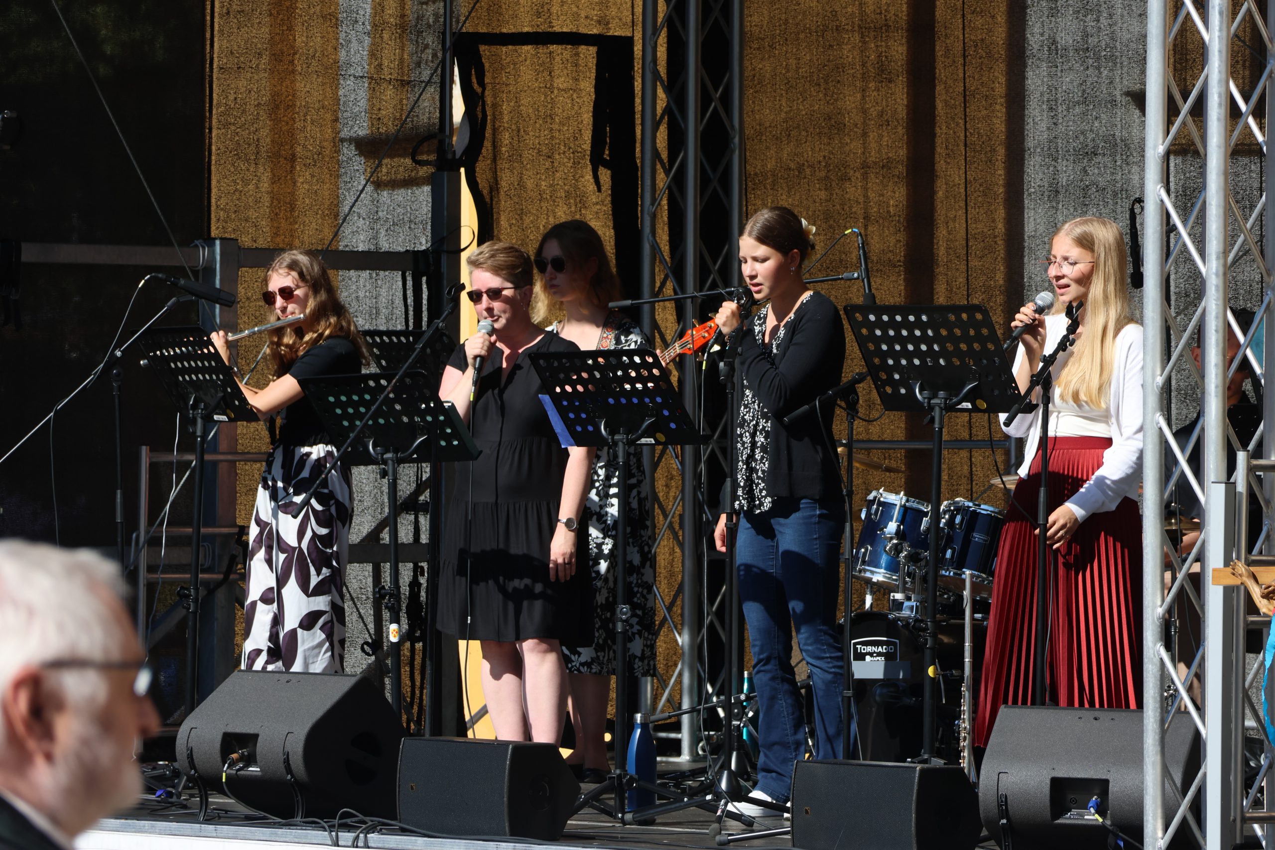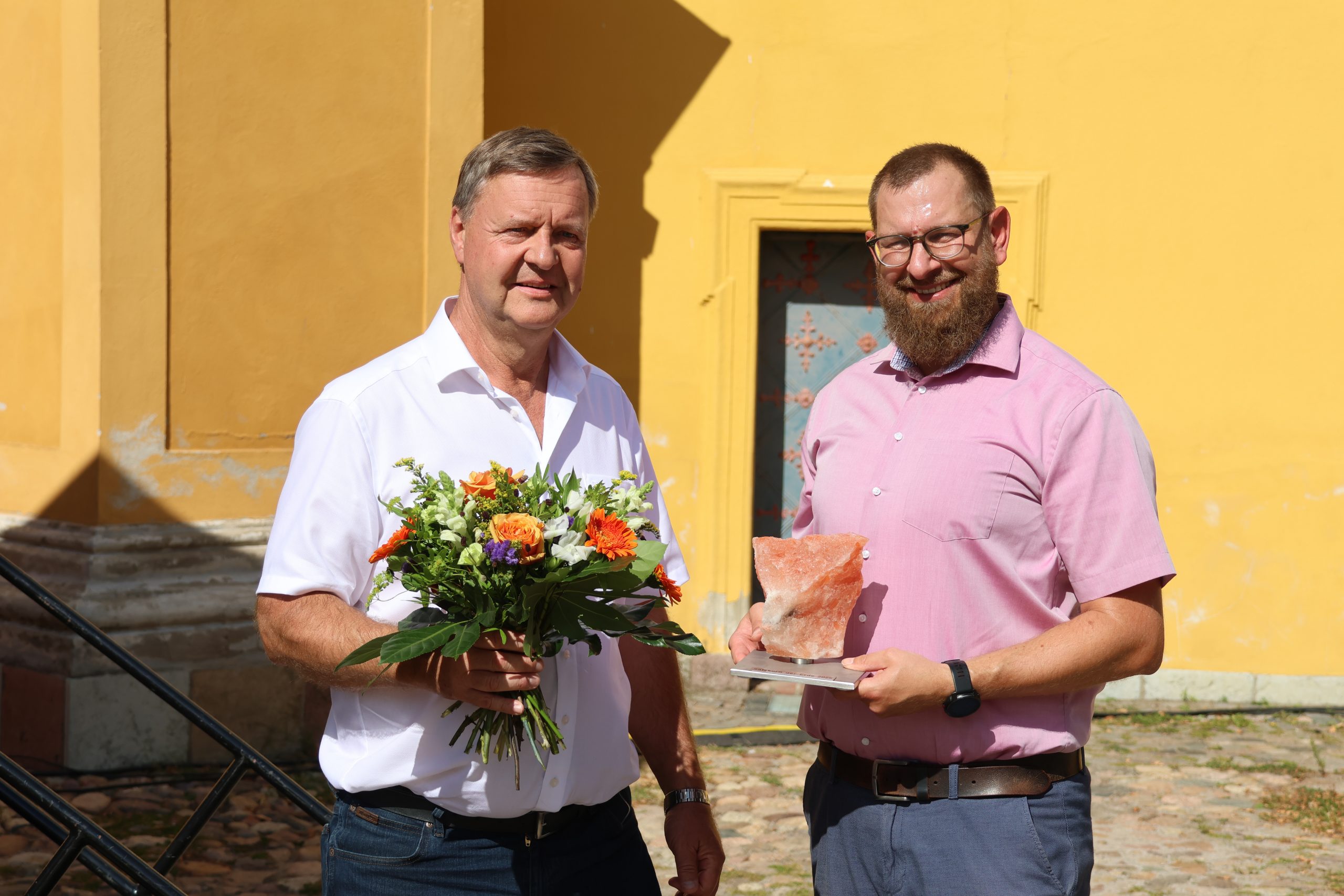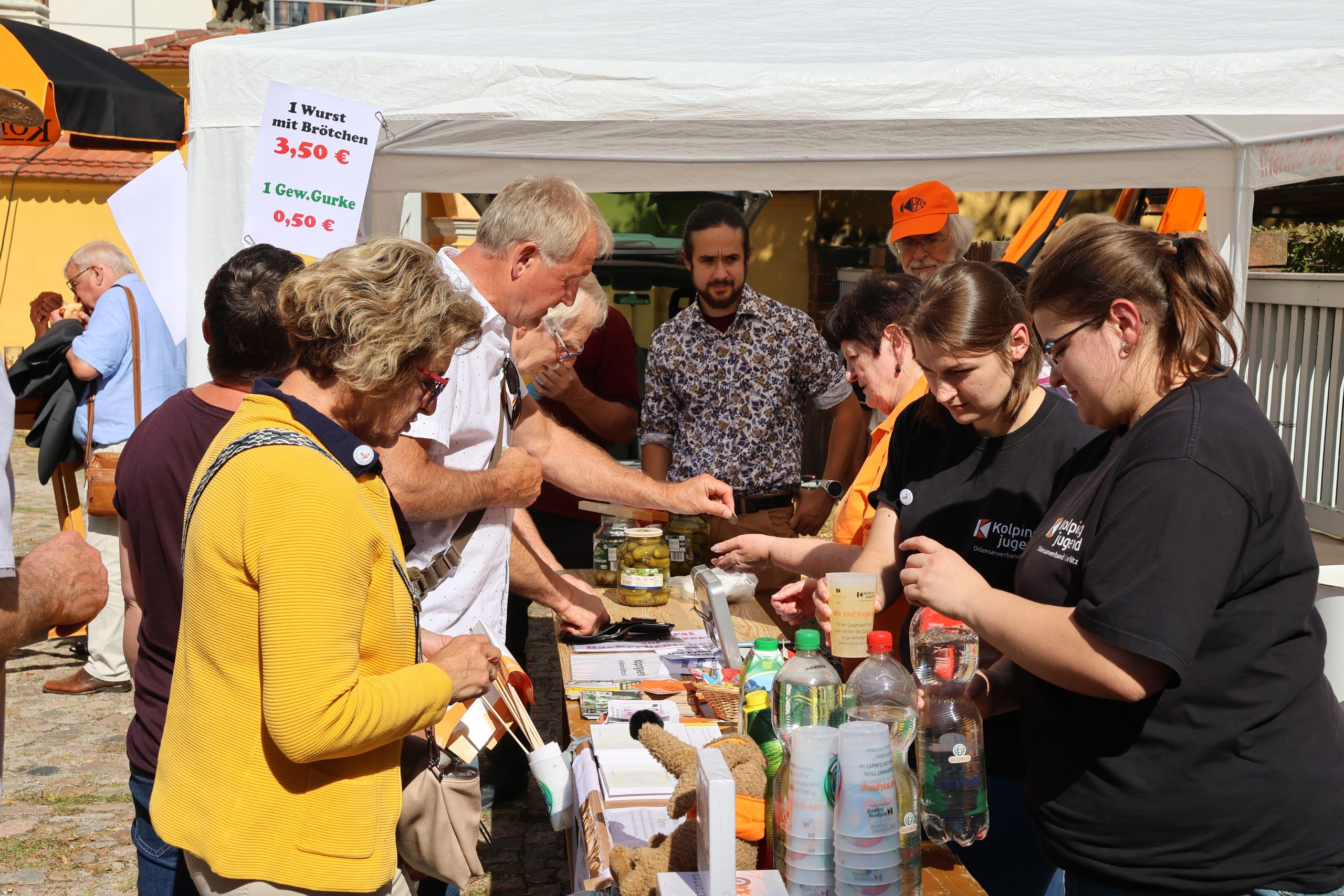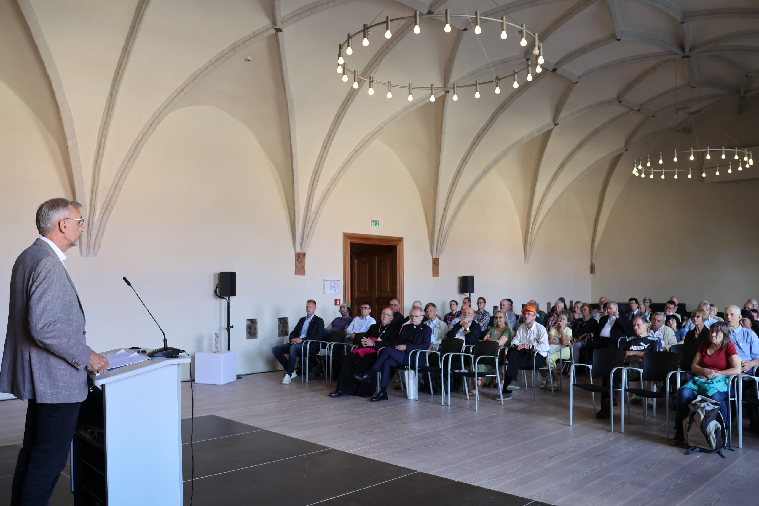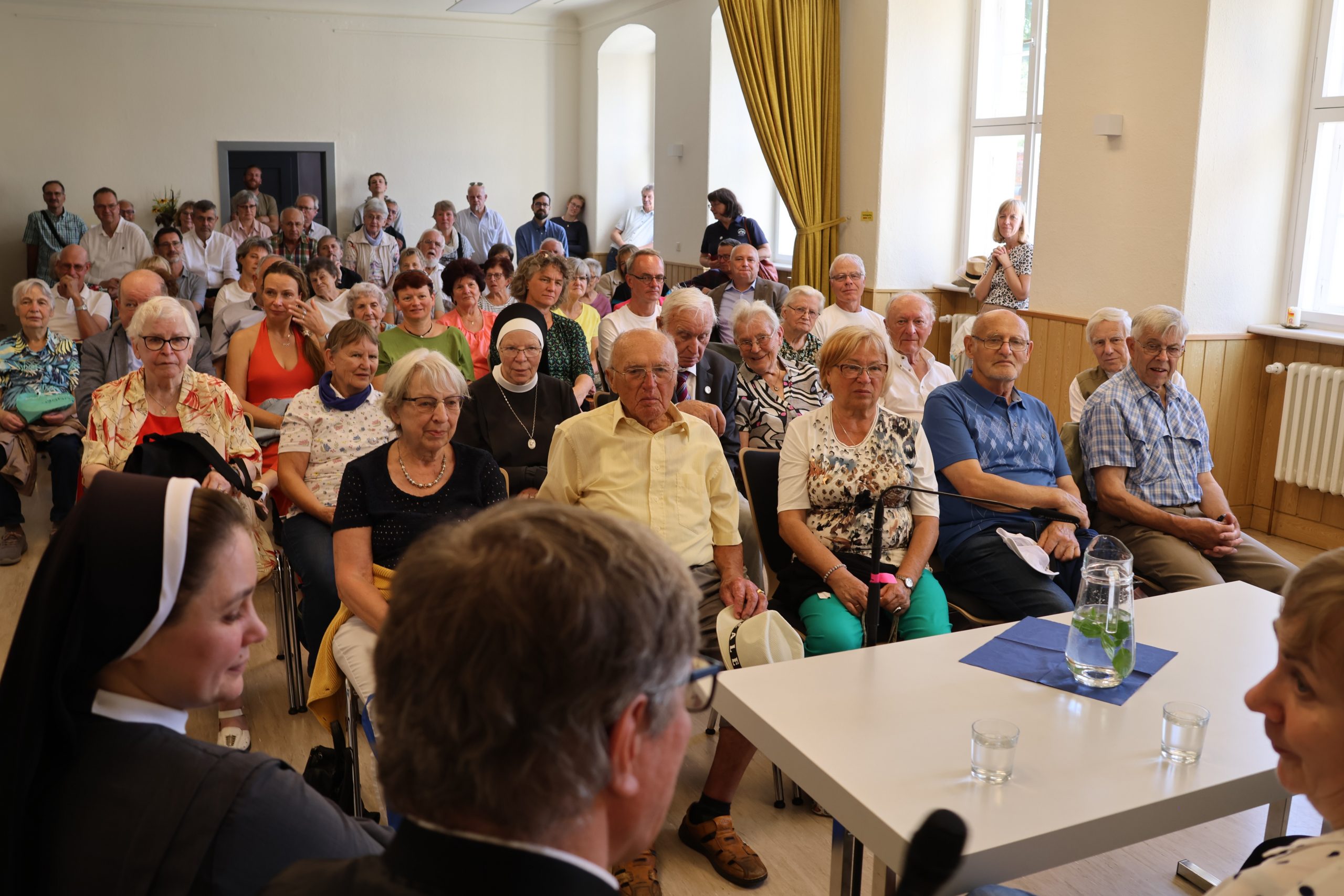 Auch die Predigt von Bischof Ipolt stand ganz im Zeichen des Jahresthemas „Pilger der Hoffnung werden“ – sie kann hier in voller Länge nachgelesen werden. Zum Ende des Hochamtes beglückwünschte Bischof Ipolt noch ein ganz besonderes Geburtstagskind unter den Teilnehmern: Prälat Peter Canisius Birkner, Dompropst und Generalvikar des Bistum Görlitz a.D., feierte seinen 90. Geburtstag. Nach dem Hochamt erwarteten die Wallfahrer traditionell zahlreiche Stände auf dem Stiftsplatz, an denen Sie von den verschiedenen Einrichtungen, Vereinen und Verbänden des Bistums mit Speis und Trank versorgt wurden. Im Anschluss konnte zwischen verschiedenen Programmpunkten gewählt werden: Zum einen hielt der Sächsische Staatsminister des Inneren Armin Schuster, der selbst römisch-katholischer Konfession ist, im Refektorium einen Vortrag über die Herausforderungen des Christseins als Politiker. Im Pfarrsaal fand unterdessen ein Podiumsgespräch zur Caritasrbeit in Russland statt und auf dem Stiftsplatz erfreuten Siegfried und Oliver Fietz zahlreiche Musikbegeisterte mit einem Mitsing-Konzert. Anschließend überreichte der Diözesanratsvorsitzende Markus Sawicki noch den Jährlich ausgelobten Preis „Salzkorn der Erde“ an Diakon Norbert Polossek, der damit für sein langjähriges ehrenamtliches Engagement in Niesky geehrt wurde.