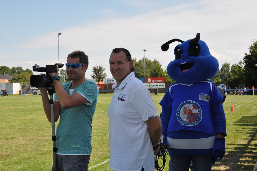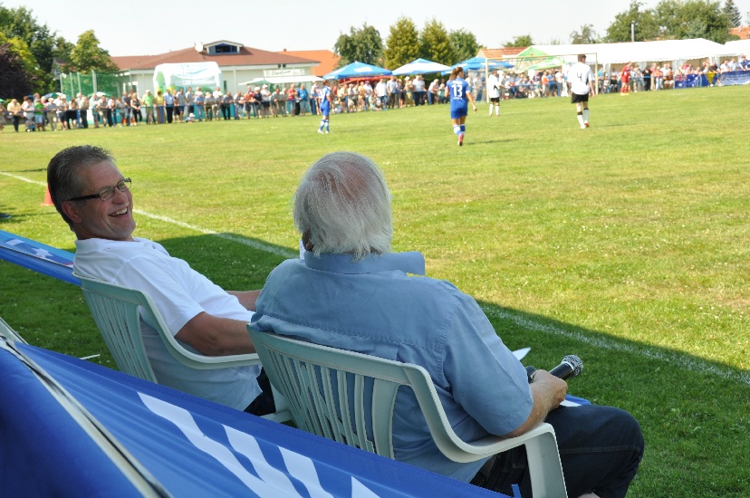 als die DJK gegründet wurde, die auf dem Glauben fußt: Körper und Seele gehören zusammen“. Inzwischen stellt sich die jüngste DJK-Kickerin vor: Laetitia. Ihr Vater, Roman Krautz, nimmt die Tochter auf den Arm, Gert Zimmermann führt mit ihr das erste Interview. Es ertönt der Anpfiff zur zweiten Halbzeit – mit weiteren fünf Toren. Nach 90 Minuten eines spannenden, vor allem fairen Spieles, steht es 4:3 für die DJK-Mannschaft. Vor einer kurzen Pressekonferenz mit beiden Trainern gibt es noch ein „Spaß-Elfmeterschießen“, das die Herren mit 5:4 ebenfalls gewinnen. Gewinnen sei schön, aber nicht entscheidend, meint Vereinspräsident Hubertus Szczepaniak. Wichtiger sei: „Sport schweißt zusammen. Wir können durch den Sport Gemeinschaft erfolgreich gestalten. Wir sind offen für alle. Unser Zusammenleben kommt aus den Wurzeln des Glaubens heraus. Die DJK ist bei Pfarrfesten dabei. Viele Blau-Weiße tanzen auf vielen Hochzeiten. DJK ist aus Wittichenau nicht wegzudenken.