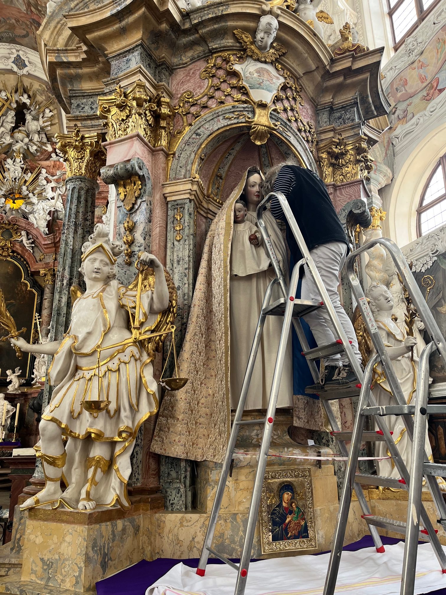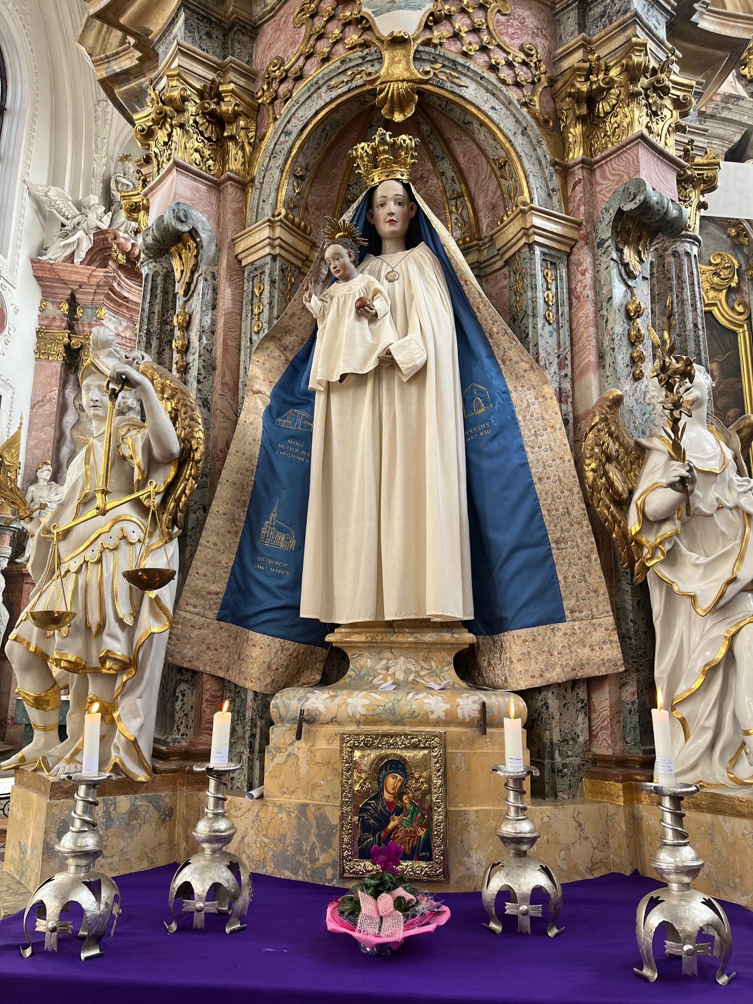Am 2. Fastensonntag, dem 01. März 2026 – eine Woche nach dem Inkrafttreten der Einpfarrung der Pfarrei Guben in die Pfarrei Neuzelle – besuchte Bischof Wolfgang die Pfarrei und feierte an allen Kirchorten die sonntägliche Eucharistie. Pater Isaak Kaefferlein O.CIst., der Pfarrer von Neuzelle, hatte im Vorfeld dafür gesorgt, dass das Gnadenbild von Neuzelle zu diesem Anlass einen neuen Mantel bekam. Schwestern aus Österreich haben auf der Innenseite des Mantels die Umrisse der Kirchen von Eisenhüttenstadt, Guben und Neuzelle eingestickt. Dieser Mantel wurde am Sonntag in der Hl. Messe in Guben gesegnet und noch am gleichen Tag im Familiengottesdienst in Neuzelle durch Frau Wunder der Mutter Gottes angezogen. Die Kirche in Guben trägt den Titel „Maria, Mutter der Kirche“ – insofern ist es beinahe symbolisch, dass ihr Bild nun auf dem Mantel der Mutter Gottes von Neuzelle zu sehen ist. Möge der gemeinsame Weg der drei Gemeinden, die nun eine Pfarrei geworden sind, gute Früchte tragen.
