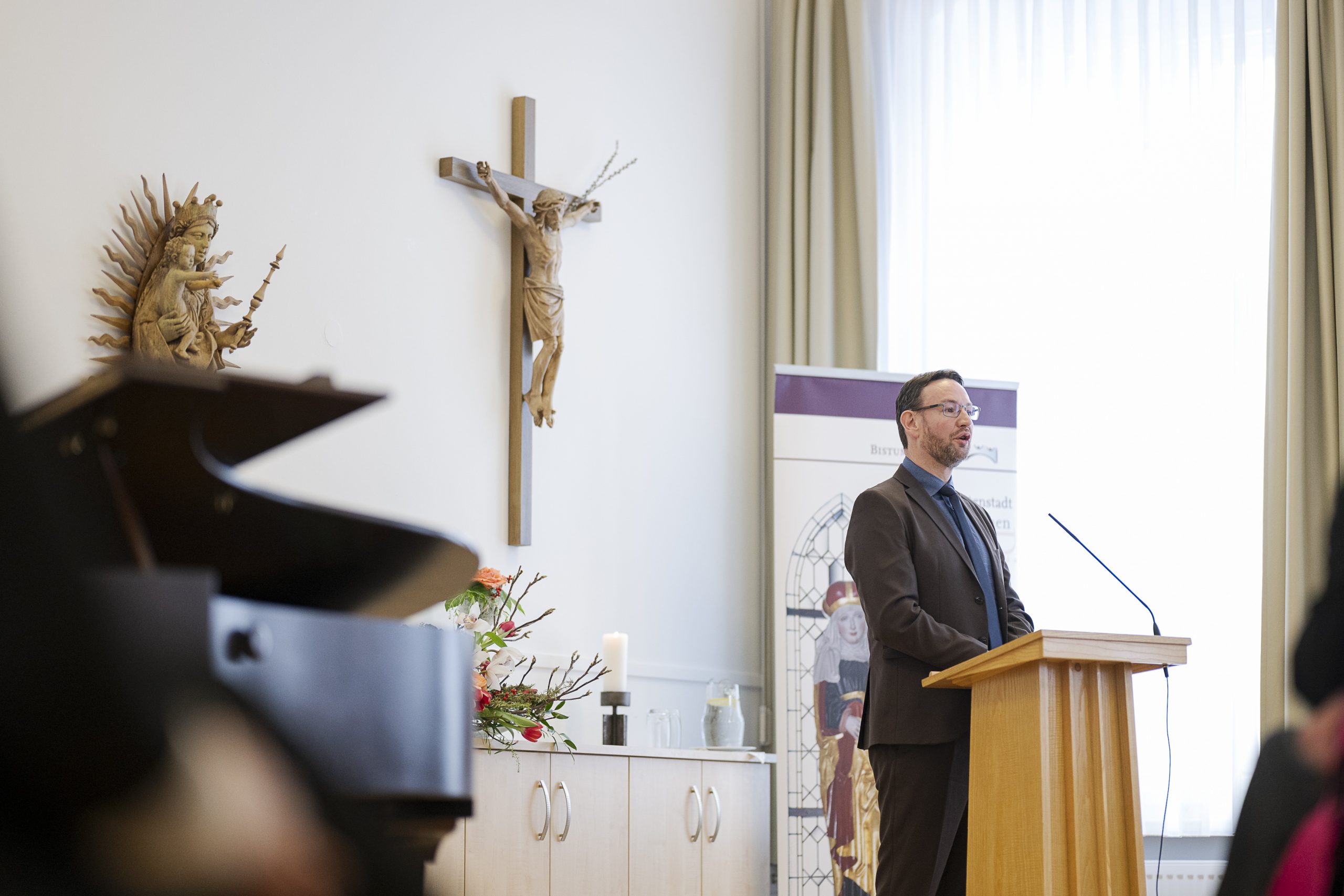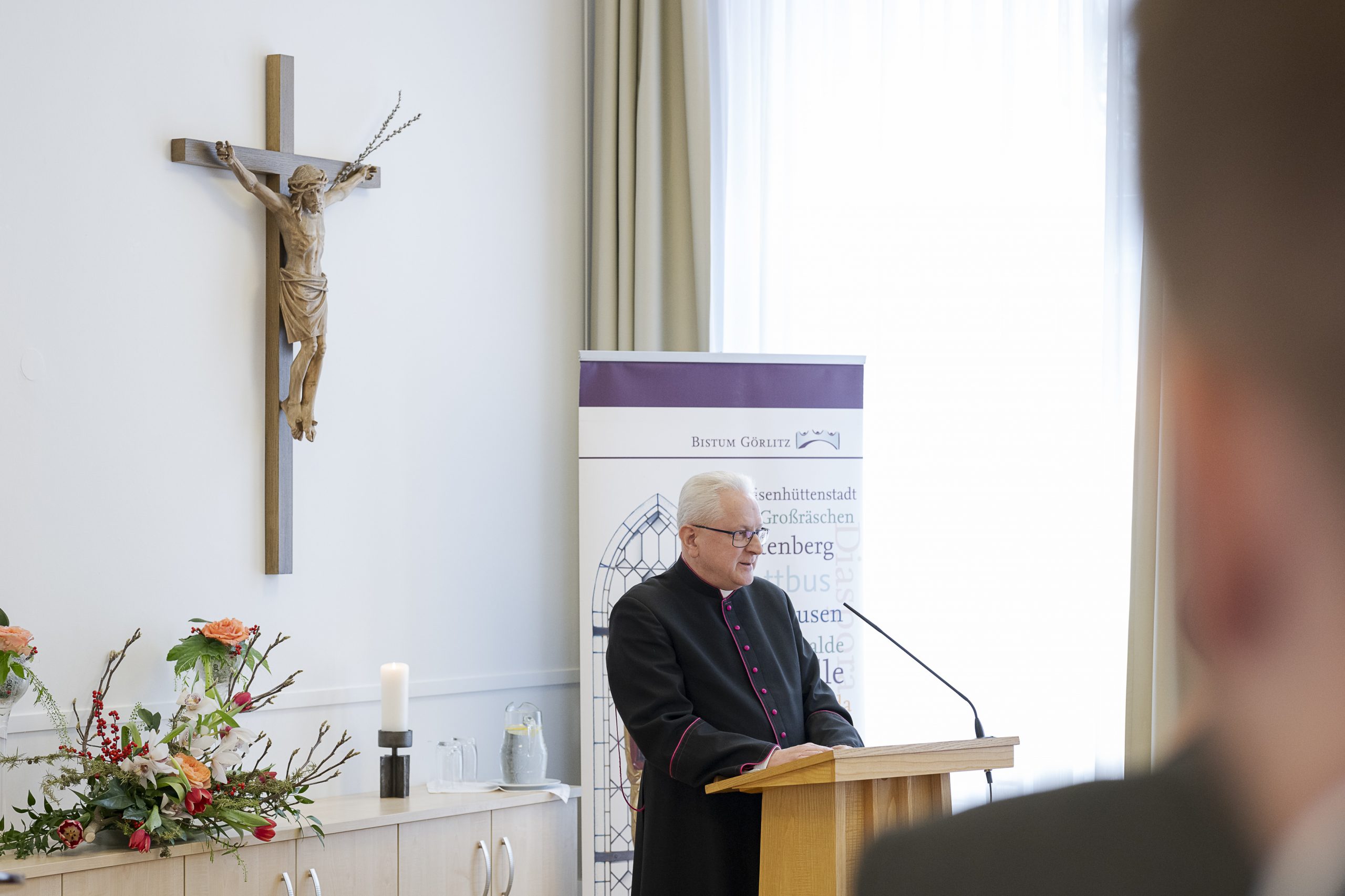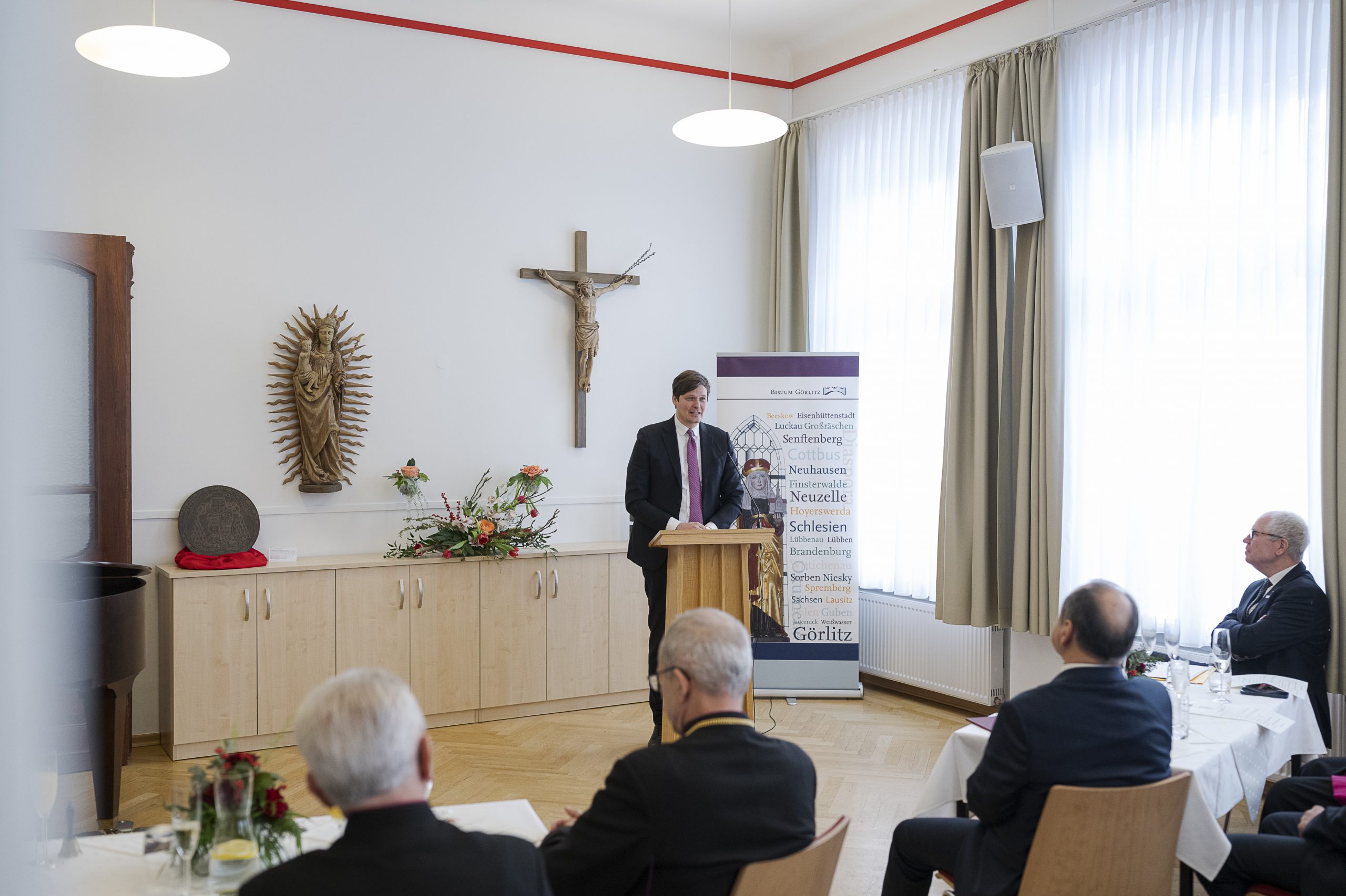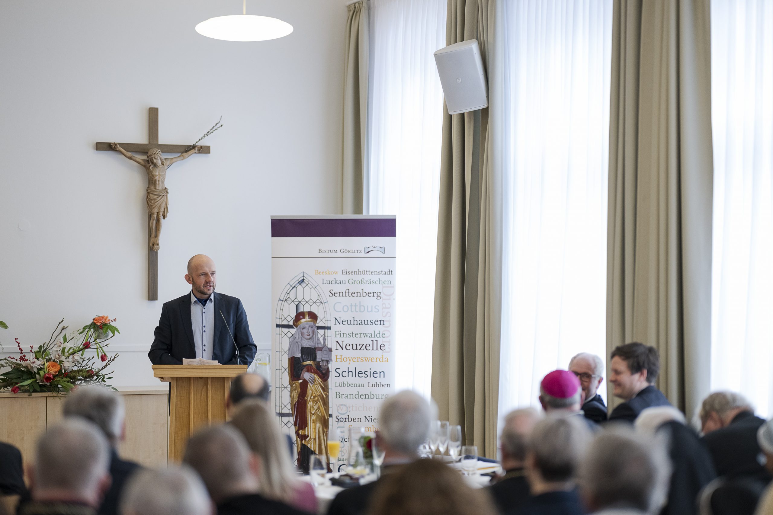 Außerdem begrüßte Generalvikar Kurzweil einen besonderen Ehrengast des Bischofs in diesem Jahr: Aus Paderborn war der Präsident des Bonfiatiuswerkes der deutschen Katholiken, Herr Landrat a.D. Manfred Müller nach Görlitz gereist. Er wandte sich im Anschluss mit einem Grußwort an die Gäste des Empfangs. Es folgten in guter Tradition das Grußwort des Diözesanrates, in diesem Jahr Vertretungsweise vorgetragen von der Geschäftsführerin Aleksandra Matczak, das Grußwort des Dekans aus Zgorzelec Jan Kułyna und des Superintendenten des Kirchenkreises Schlesische Oberlausitz Pfarrer Daniel Schmidt in Vertretung von Frau Superintendentin Theresa Rinecker.