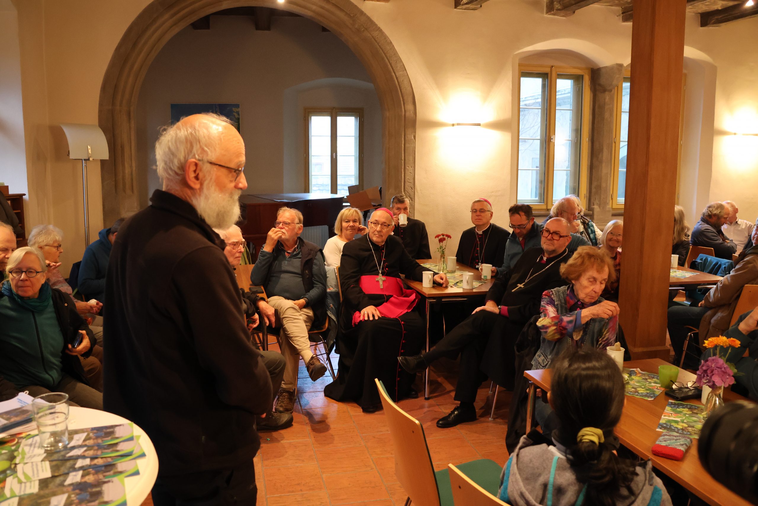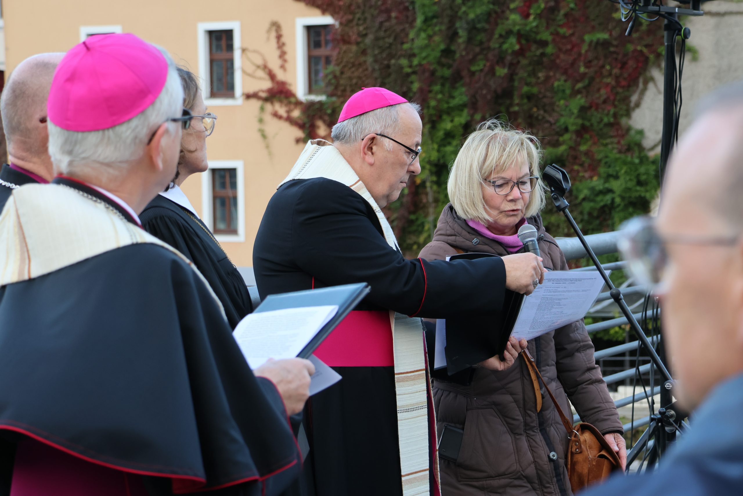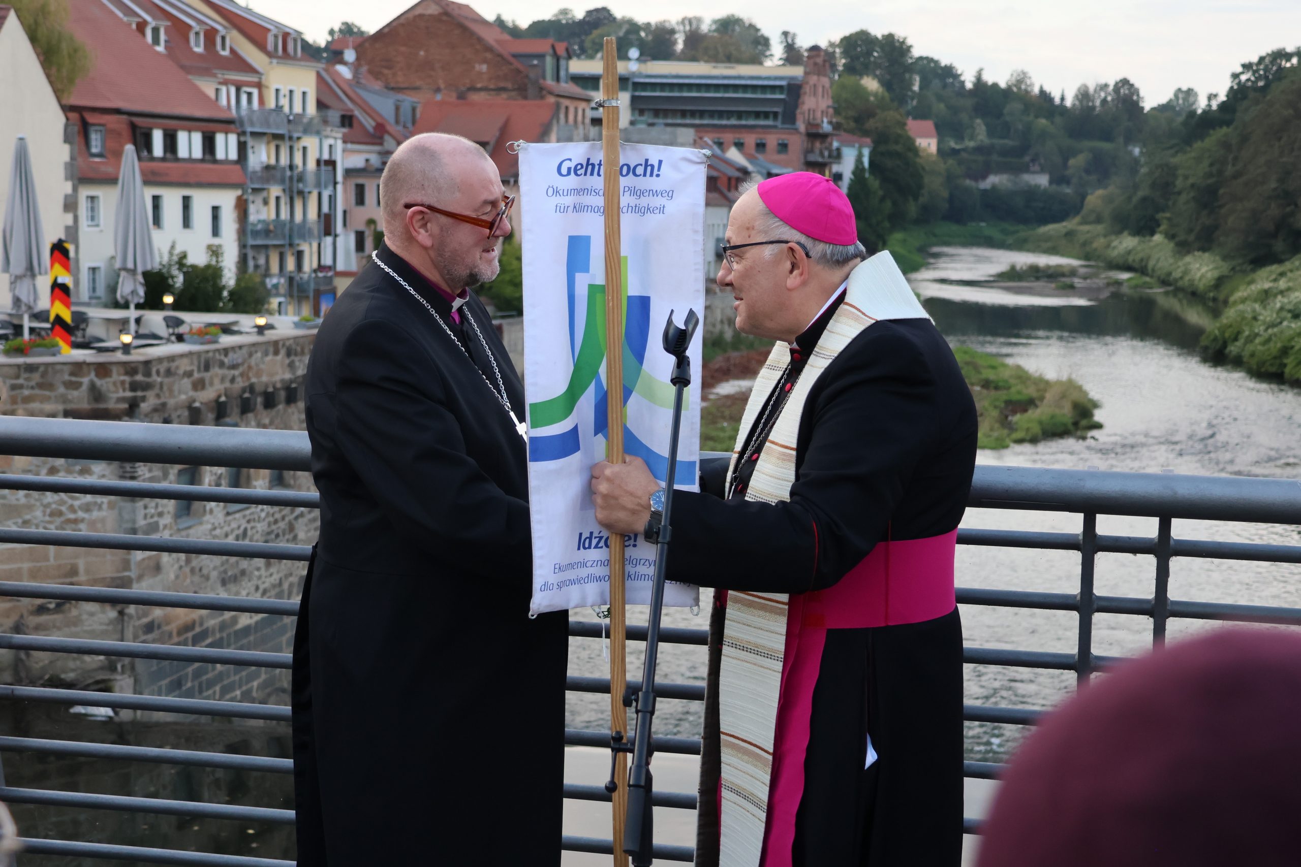 Am heutigen Donnerstag, dem 2. Oktober 2025, traf eine Gruppe von Klimapilgern an der Görlitzer Altstadtbrücke ein, von wo aus Sie morgen ihren Weg in Richtung Polen fortsetzt. Anlässlich ihrer Station, die Sie heute in Görlitz machten, kamen die Pilger zu einer deutsch-polnischen Andacht zusammen, die ökumenisch gestaltet wurde. Von katholisch-deutscher Seite gestaltete Bischof Wolfgang Ipolt die Andacht mit, der den Pilgerweg auch als Schirmherr begleitet. Sein Grußwort anlässlich dieser Schirmherrschaft kann hier in voller Länge nachgelesen werden. Aus dem Bistum Liegnitz war Bischof Andrzej Siemieniewski anwesend, ebenso wie der evangelische Bischof a.D. von Breslau Waldemar Pytel und dessen deutsche Amtskollegin Generalsuperintendentin Theresa Rinecker. So bat der Leiter der Pilgergruppe Dr. Christian Seidel am Schluss der Andacht Bischof Ipolt, den Pilgerstab symbolisch an Bischof Pytel zu überreichen, um sowohl den ökumenischen als auch den grenzübergreifenden Charakter der Pilgerfahrt zu symbolisieren. Im Anschluss an die Andacht waren alle Teilnehmer noch ins nahgelegene Martin-Moller-Haus der evangelischen Innestadtgemeinde eingeladen, wo es Gelegenheit zum Aufwärmen, zur Stärkung und zur Information über die Hintergründe der Klimapilger-Bewegung gab, die auch auf der Internetseite www.klimapilgern.de nachgelesen werden können.