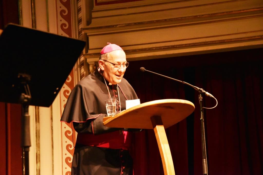 Von der Kathedrale führte der Weg zum Gerhard-Hauptmann-Theater auf dem Demianiplatz. Dort begrüßte Bischof Ipolt um 19.30 Uhr die Gäste im bis in den zweiten Rang fast voll besetzten großen Saal des Theaters und kündigt die ersten zwei Musikstücke an, von Johann Sebastian Bach die Sonate E-Dur für Violine und obligates Cembalo, BWV 1016 – Adagio und Allegro, gespielt von Lorenz Zenker, stellvertretender Konzertmeister der Neuen Lausitzer Philharmonie (Violine) und Diözesankirchenmusikdirektor Thomas Seyda (Cembalo).