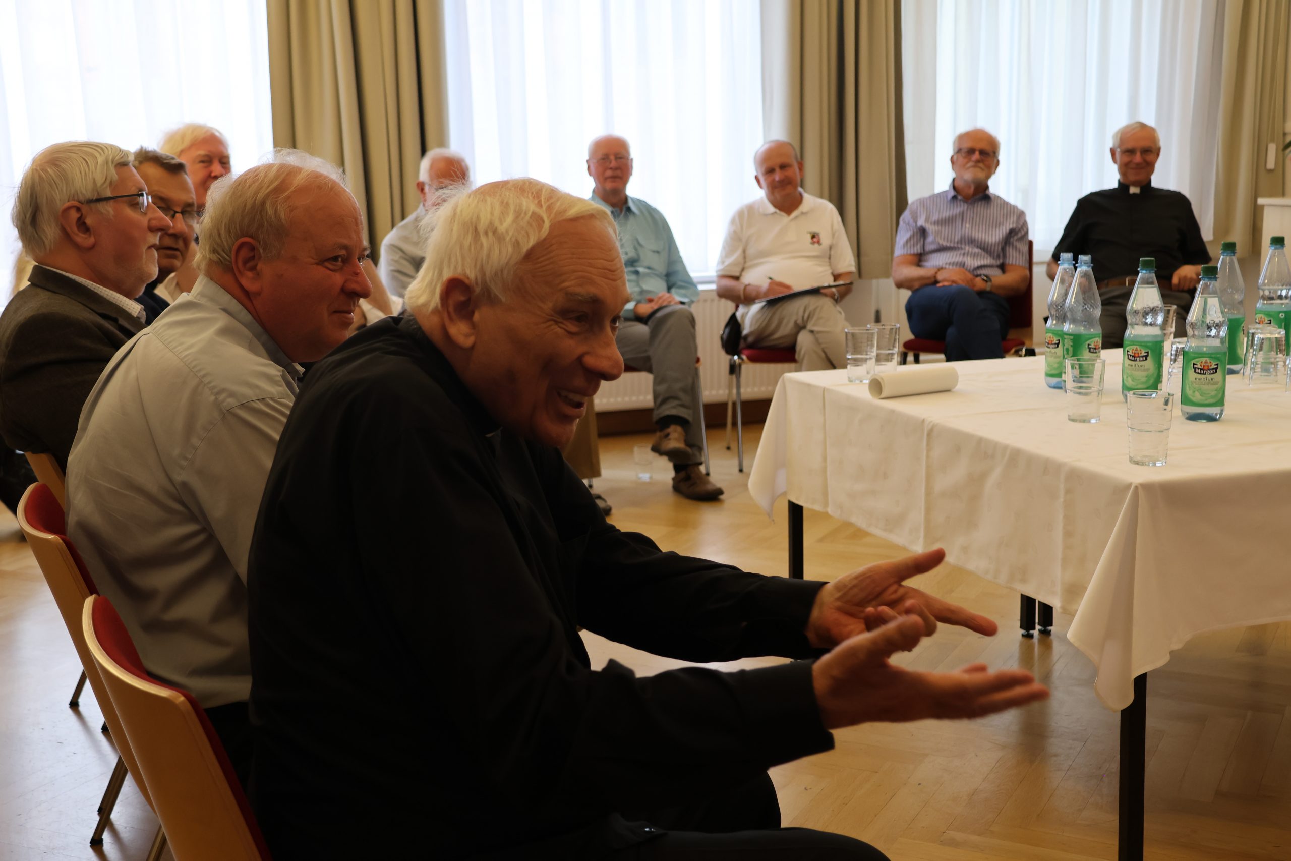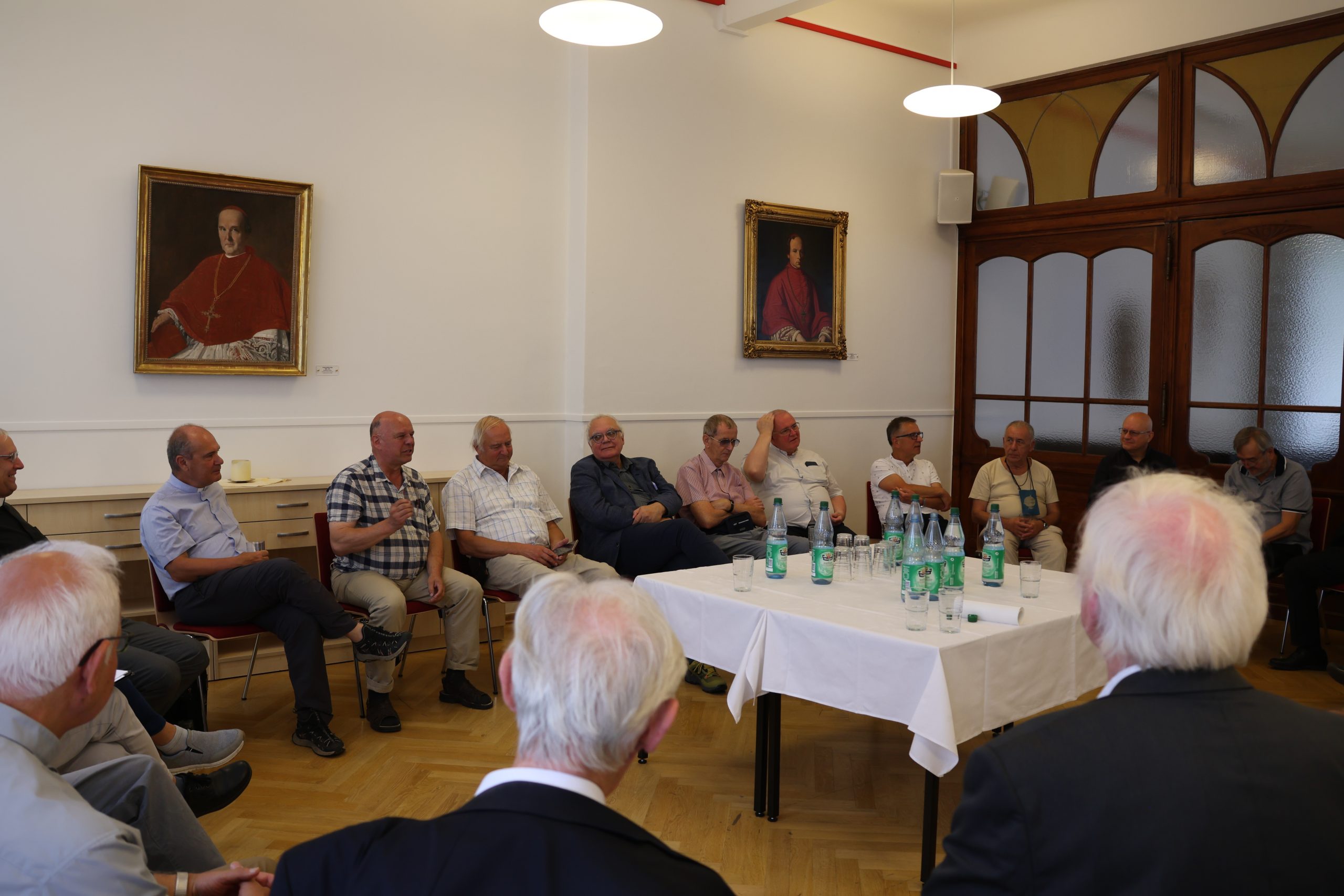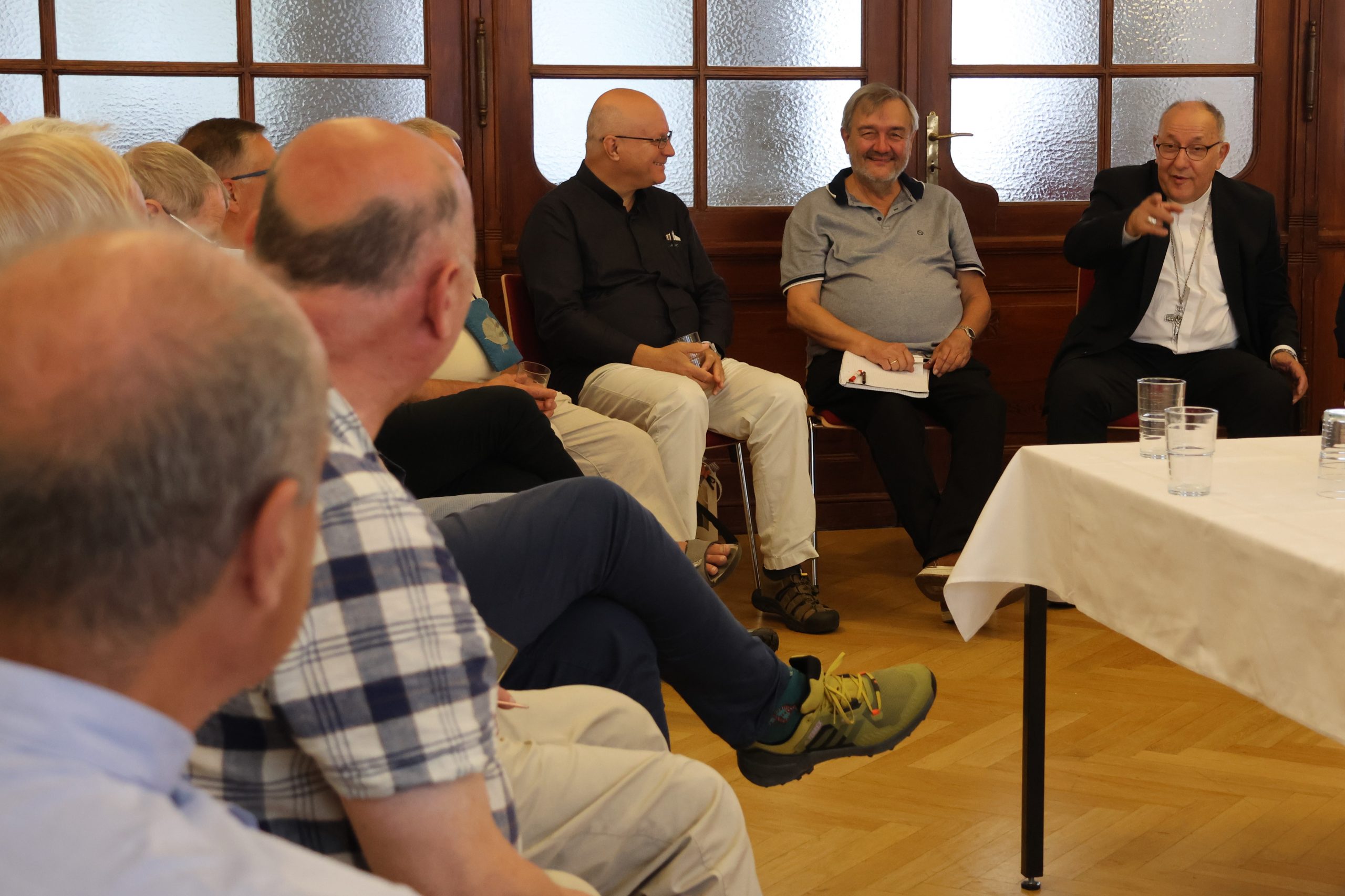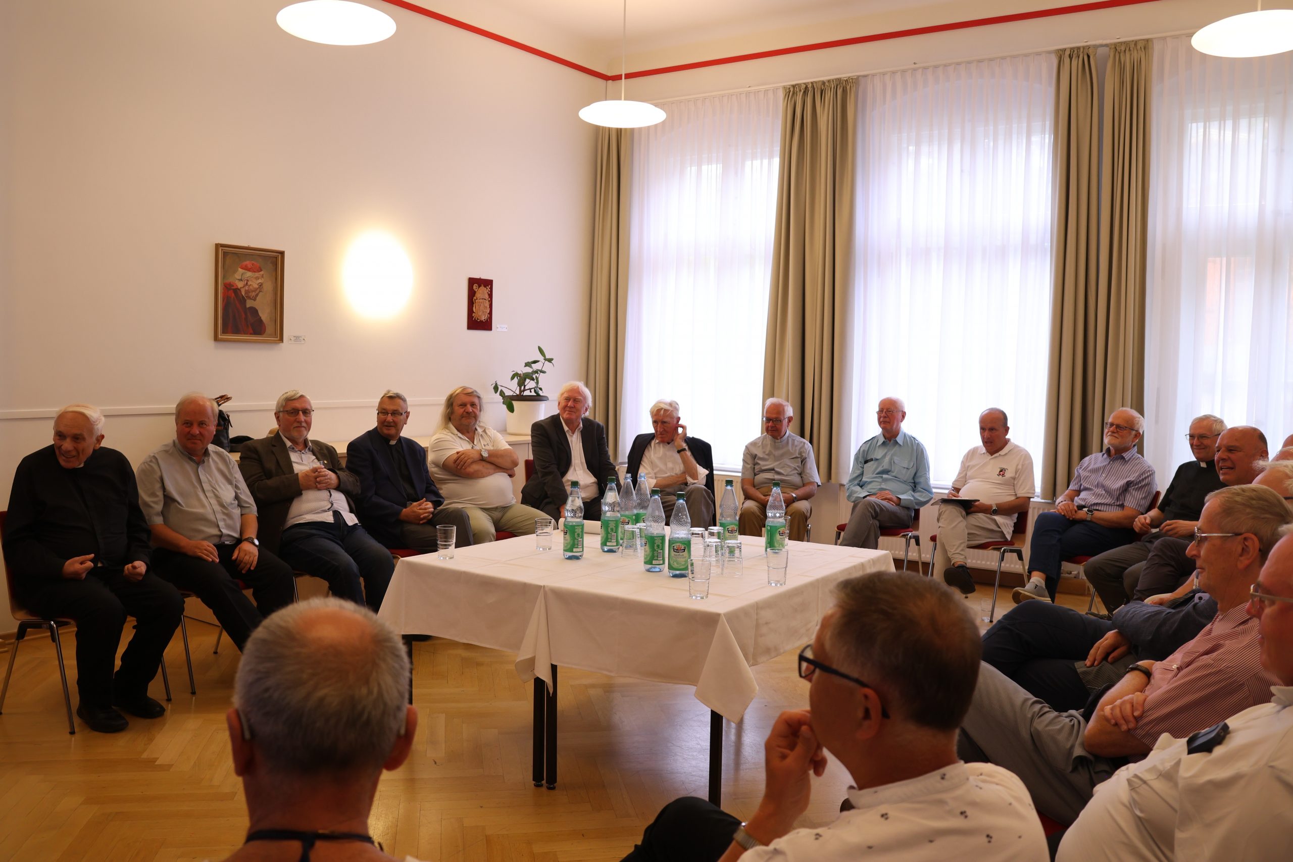 Etwa 25 tschechische Priester besuchen aktuell im Rahmen einer vom Sudetendeutschen Priesterwerk organisierten Urlaubswoche das Bistum Görlitz. Seit Montag, den 25. August 2025 weilen sie im Bistum, wo sie im St.-Wenzelslaus-Stift in Jauernick-Buschbach übernachten. Am heutigen Mittwoch, den 27. August 2025 kamen die Teilnehmer mit Bischof Wolfgang Ipolt zusammen. Zunächst feierten Sie um 10 Uhr gemeinsam die Heilige Messe in der Kathedrale St. Jakobus, anschließend kamen Sie mit dem Bischof im St.-Otto-Stift zu einer Gesprächsrunde zusammen. In brüderlicher Atmosphäre tauschten sich die Teilnehmer dabei mithilfe einer Dolmetscherin über sprachliche Grenzen hinweg u.a. über die Gemeinsamkeiten und Unterschiede Ihrer priesterlichen Lebenswege in der ehemaligen CSSR bzw. DDR aus. Auch über das Zusammenwachsen von Deutschland, Tschechien und Polen im Dreiländereck durch die Europäische Integration wurde sich lebhaft ausgetauscht. Die Gesprächsrunde trug so zu einem noch besseren Verständnis für die jeweils andere Nation bei und unterstrich die enge Verbundenheit unseres Bistums mit unseren Tschechischen Nachbarn und Freunden.