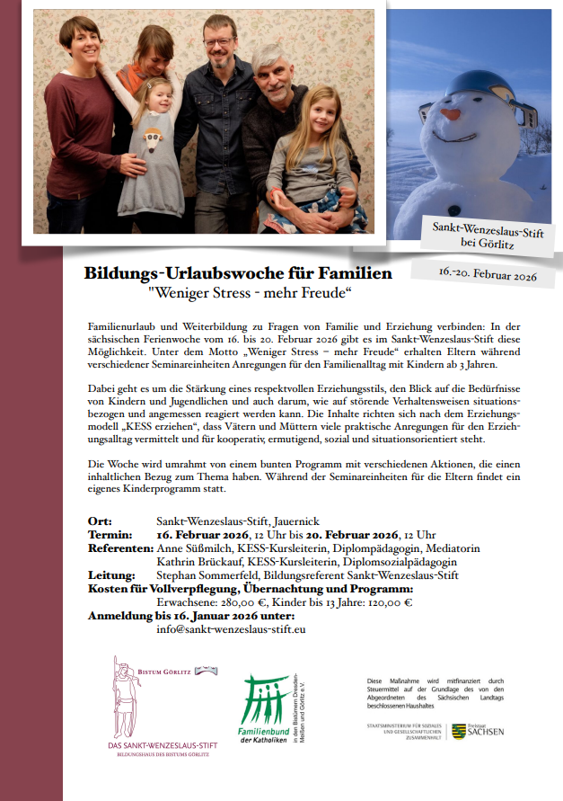 Familienurlaub und Weiterbildung zu Fragen von Familie und Erziehung verbinden: In der sächsischen Ferienwoche vom 16. bis 20. Februar 2026 gibt es im Sankt-Wenzeslaus-Stift diese Möglichkeit. Unter dem Motto „Weniger Stress – mehr Freude“ erhalten Eltern während verschiedener Seminareinheiten Anregungen für den Familienalltag mit Kindern ab 3 Jahren. Dabei geht es um die Stärkung eines respektvollen Erziehungsstils, den Blick auf die Bedürfnisse von Kindern und Jugendlichen und auch darum, wie auf störende Verhaltensweisen situationsbezogen und angemessen reagiert werden kann. Die Inhalte richten sich nach dem Erziehungsmodell „KESS erziehen“, dass Vätern und Müttern viele praktische Anregungen für den Erziehungsalltag vermittelt und für kooperativ, ermutigend, sozial und situationsorientiert steht.