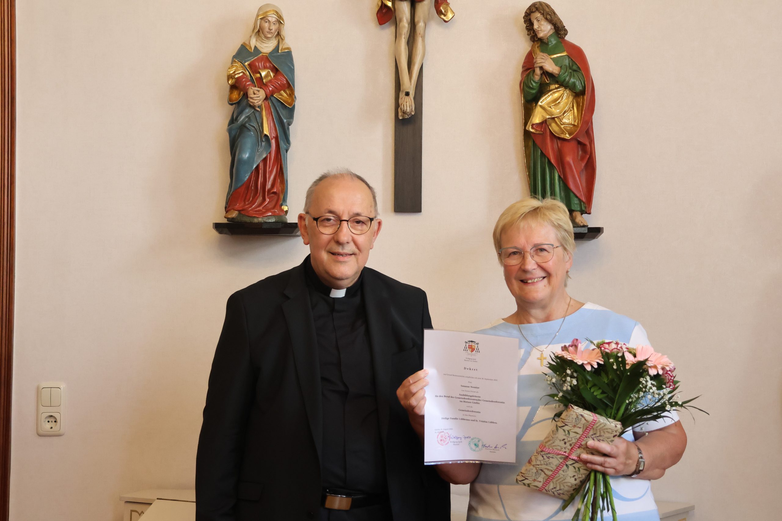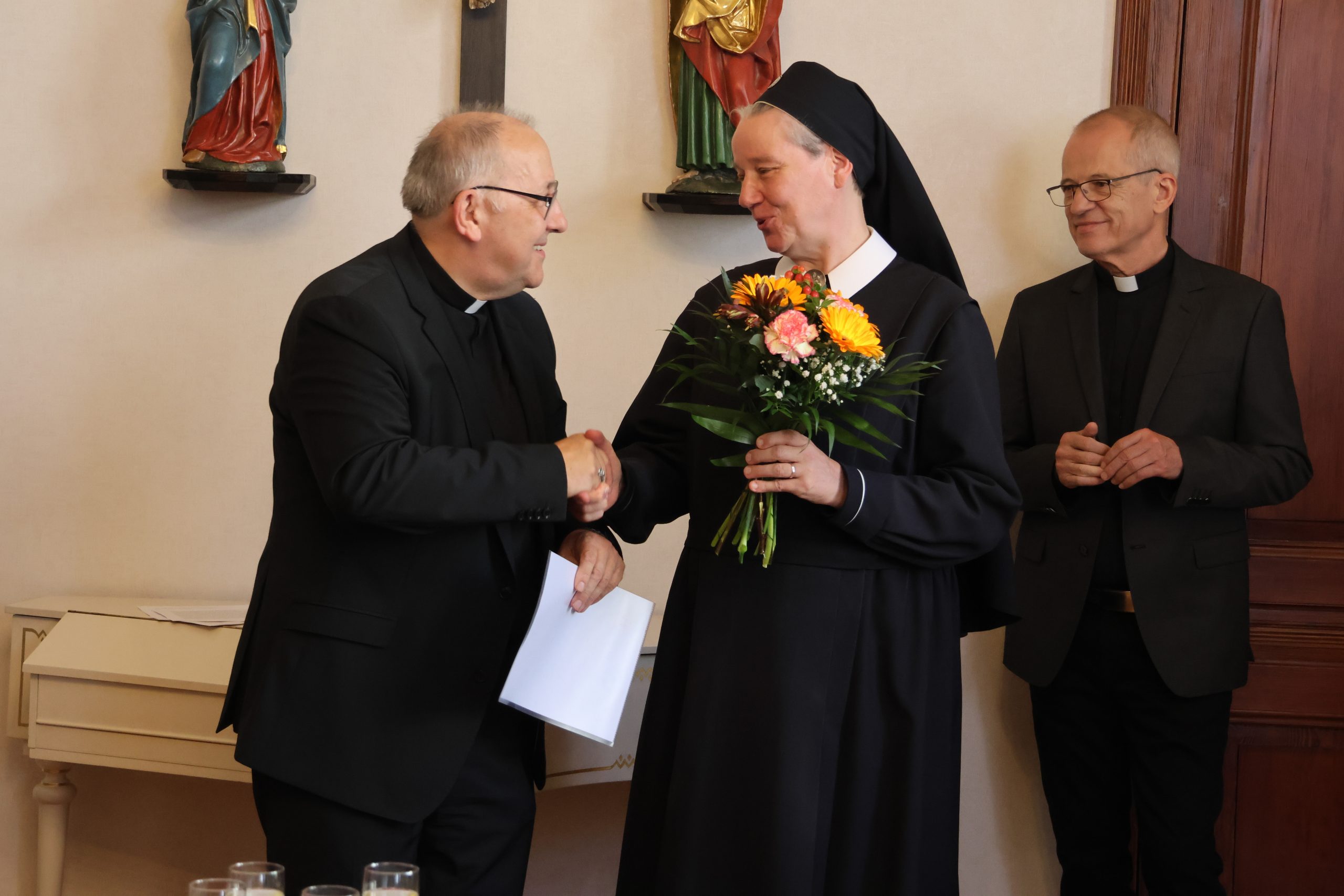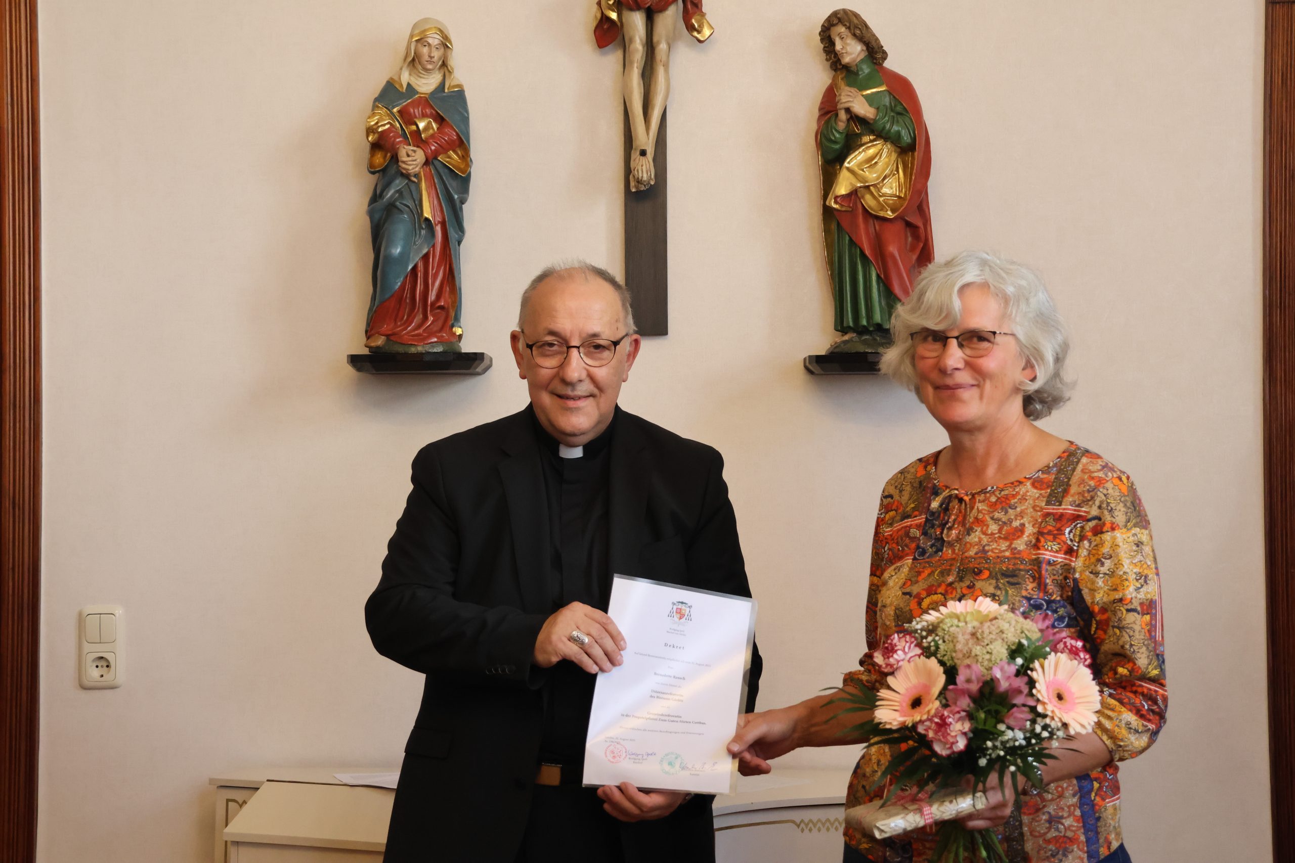Am heutigen Donnerstag, den 28. August 2025, hat Bischof Ipolt im Anschluss an die Mitarbeitermesse des Bischöflichen Ordinariates sowohl Frau Susanne Nomine als auch Frau Bernadette Rausch von ihren jeweiligen Bischöflichen Beauftragungen entpflichtet. Bei beiden ist der Eintritt in den Ruhestand der Grund. Frau Nomine wird zum 30. September 2025 ihren Dienst als Ausbildungsleiterin für den Beruf des Gemeindereferenten im Bistum Görlitz beenden. Frau Bernadette Rausch wird zum 31. August 2025 aus ihrem Dienst als Beauftragte für die Gemeinderefernten des Bistums scheiden. Diese beiden Aufgaben werden ab dem 1. Oktober 2025 in Personalunion von Schwester M. Victoria Jazdzewski übernommen. Schließlich bedankte sich Bischof Ipolt bei Frau Rausch für ihre Bereitschaft, in ihrem nun beginnenden Ruhestand ehrenamtliche Ansprechpartnerin für die Gemeindereferenten des Bistums im Ruhestand zu sein.